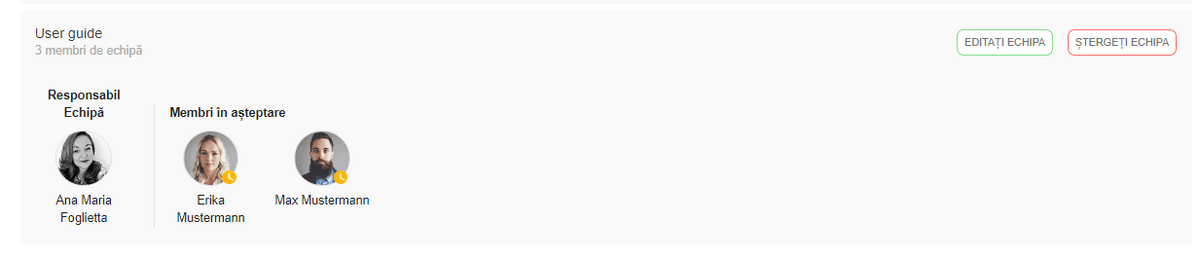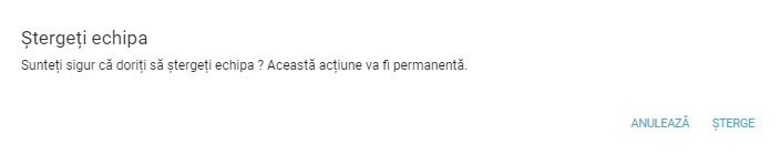 Prin apăsarea butonului Ștergere atribuit fiecărui membru al echipei, acest membru va fi eliminat din echipă, iar el/ea va fi notificat despre această acțiune.