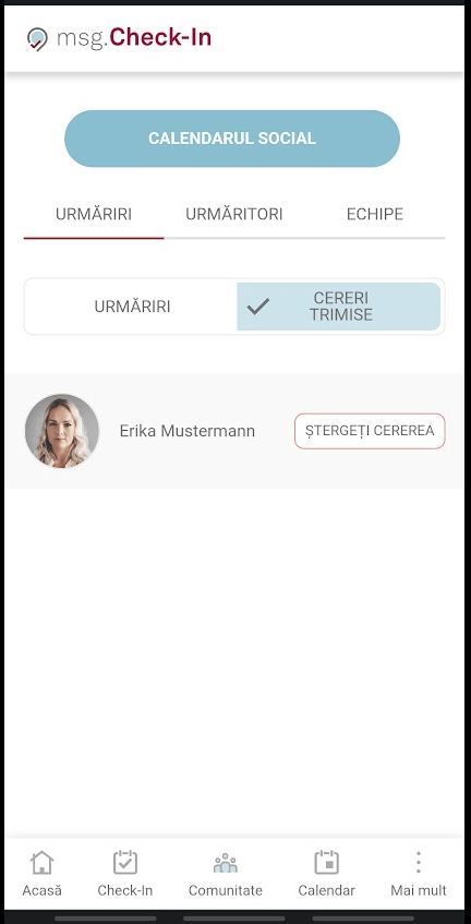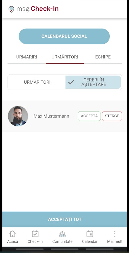 Acceptând solicitarea dvs. de urmărire, colegii vă vor oferi acces pentru a le vedea activitatea și profilul în aplicație. Mai exact, puteți vedea check-in-urile lor zilnice și puteți găsi check-in-urile lor viitoare, accesând Calendarul Social. De asemenea, în cazul în care colegii dvs. au profilul privat, odată ce fac parte din lista dvs. de urmăriri, profilul lor nu va mai fi privat pentru dvs.