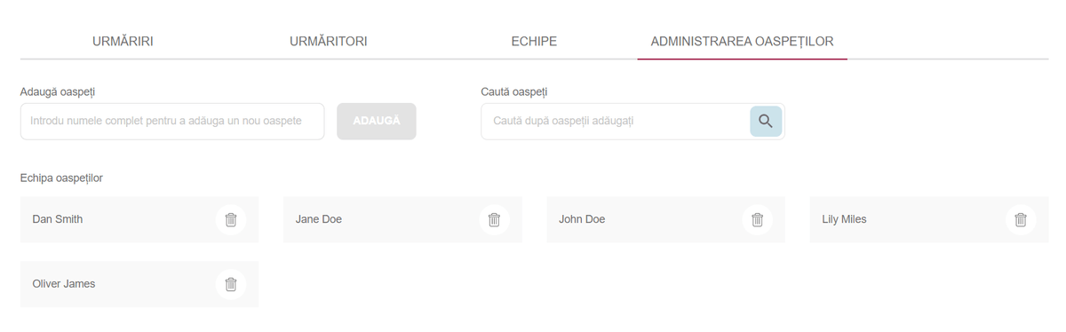 În cazul în care utilizatorul are rolul de administrator recepție, acesta va vedea o nouă filă numită Administrarea Oaspeților. În această secțiune, utilizatorul poate adăuga profile de invitați introducând numele lor complet în câmpul de introducere și făcând clic pe butonul Adăugare. De asemenea, utilizatorul poate căuta după numele unui oaspete sau poate șterge o intrare deja creată. Toți oaspeții adăugați vor forma echipa de oaspeți a utilizatorului. În cazul în care administratorul recepției adaugă noi oaspeți în timpul procesului de gestionare a membrilor unui check-in deja creat, numele acestora vor fi vizibile ulterior și în această secțiune.