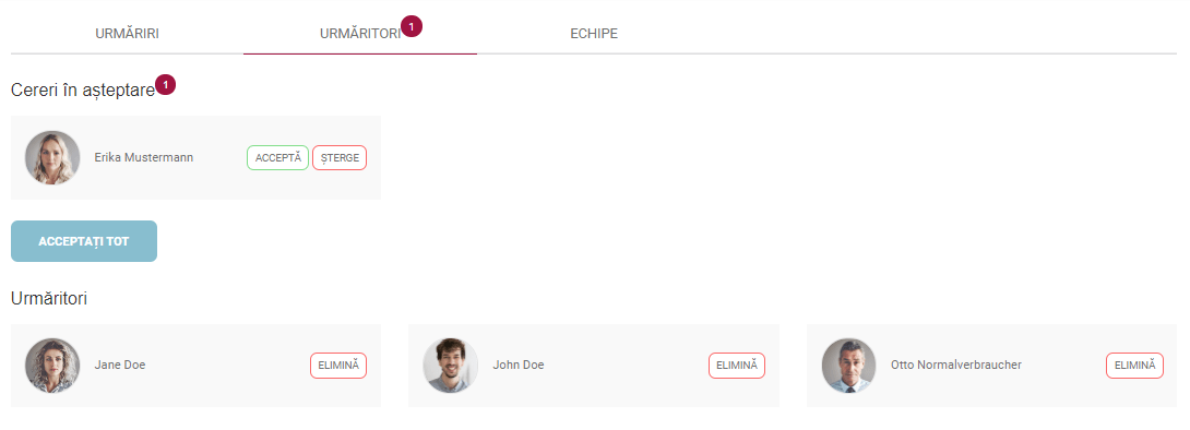 Tab-ul Urmăritori din pagina Comunitate afișează toți utilizatorii care vă urmăresc în prezent, aratând totodată și toate solicitările de urmărire primite. Pentru cererile primite, veți avea opțiunea de a accepta sau de a respinge cererea. Pe baza setărilor de notificare din profilul dvs., sunteți notificat prin e-mail și/sau push cu privire la toate solicitările primite. În cazul în care există mai multe solicitări disponibile, este posibil să le acceptați pe toate făcând clic pe butonul Acceptați tot. Solicitările în așteptare sunt afișate în secțiunea Cereri în așteptare. Odată ce o solicitare este acceptată, acel utilizator devine acum parte din lista de urmăritori, aflată sub secțiunea a doua de pe pagină.