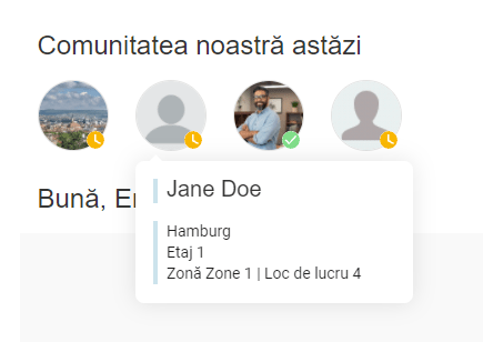 Prima secțiune disponibilă este cea care afișează check-in-urile din ziua curentă ale utilizatorilor care fac parte din comunitatea utilizatorului logat. În partea dreaptă de jos a fotografiei utilizatorului, este afișată o pictogramă colorată pentru a informa dacă înregistrarea utilizatorului este confirmată (verde) sau nu (galbenă). Prin accesarea unei înregistrări, utilizatorul poate vedea numele, departamentul și informațiile legate de check-in-ul colegului din ziua curentă.