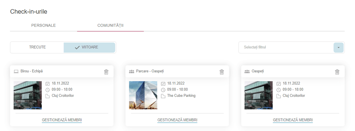 Secțiunea Check-in-urile Comunității afișează toate check-in-urile de echipă create de utilizator precum și check-in-urile create pentru oaspeți. Utilizatorul poate comuta între înregistrările trecute și cele viitoare și își poate filtra check-in-urile și în cadrul acestei secțiuni.