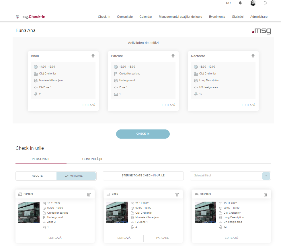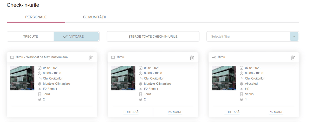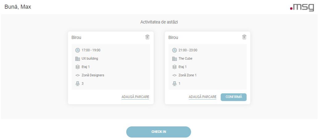 Cardurile aferente check-in-urilor viitoare sunt afișate în ordine cronologică, iar făcând clic pe ele, utilizatorul navighează la secțiunea Calendarul meu, unde sunt afișate toate detaliile despre check-in-ul selectat. Fiecare card are și un buton de ștergere. De asemenea, fiecare card ce reprezintă un check-in la birou are atașată și opțiunea de a crea un nou check-in de parcare prin apăsarea butonului corespunzător (dacă această funcție a fost activată de administrator). Butonul Parcare nu este disponibil pentru înregistrările la cafeterie/spații de recreere sau pentru check-in-urile efectuate de altcineva. Cardurile de check-in individuale conțin și butonul Editare care permite utilizatorilor să modifice un check-in existent prin schimbarea locului, a datei și a orei.