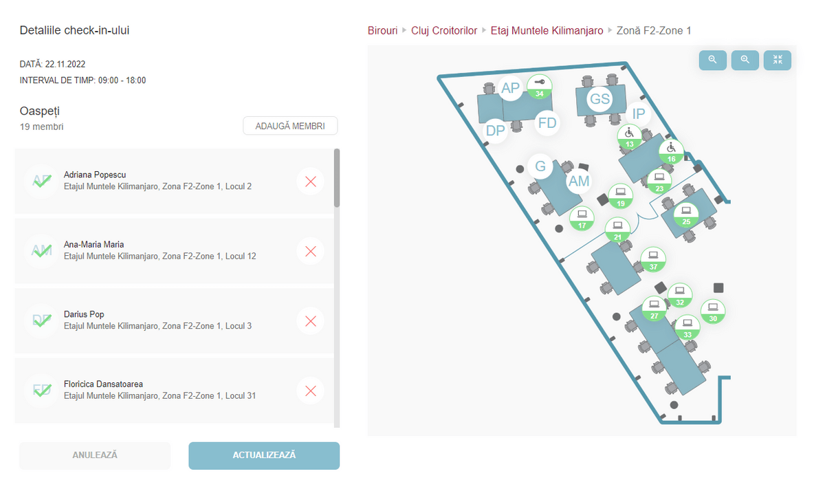 După ce face clic pe un card de check-in viitor, utilizatorul navighează la secțiunea Calendarul Social, având echipa corespunzătoare selectată. De asemenea, toate aceste carduri conțin un buton numit Gestionează membri. Făcând clic pe el, utilizatorul ajunge pe o pagină nouă, unde poate actualiza check-in-ul echipei respective,fie eliminând membri din check-in, fie adăugând membrii noi sau chiar actualizând locul pentru unii membri. Utilizatorul nu poate însă schimba data/ora check-in-ului. Toate modificările vor fi aplicate după ce utilizatorul face clic pe butonul Actualizează. În cazul în care utilizatorul s-a răzgândit, poate face clic pe butonul Anulează.